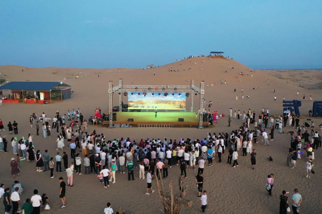 傍晚时分,武威沙漠景区里更显热闹。文艺表演、篝火晚会与沙海烟花交相辉映,台上流光溢彩,台下掌声如潮。这场融合经典与现代、本土与流行的视听盛宴,让武威沙漠景区并未因高温酷暑而褪去热度。文化惠民演出带动更多本地和外地游客走进沙漠欣赏精彩的节目。如今长城镇从黄沙漫漫变成游人如织的文旅热土,为打造“中国沙漠旅游小镇”品牌注入强劲动力。