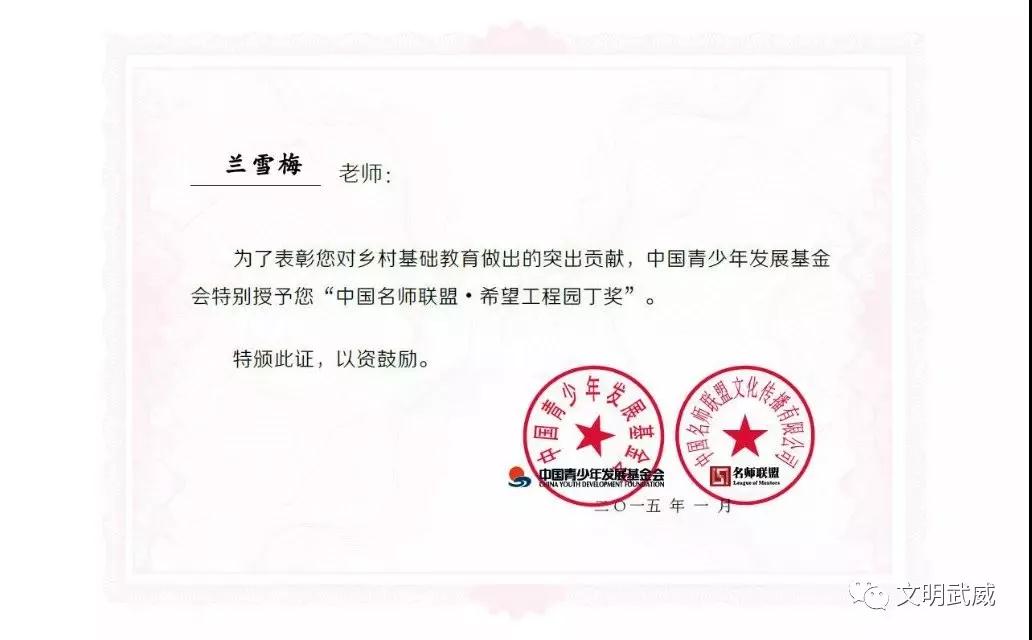 个人简介 兰雪梅同志,生于1986年9月,2009年参加工作,是一名普通的乡村教师,长期从事农村留守儿童关爱帮扶工作。目前已在“微益中国”平台完成项目近百个,争取项目资金数位居全国前列。2015年,被中国青少年发展基金会评为“中国名师联盟·希望工程园丁奖”;2016年,被团中央评为“中国青年好网民”。 2014年的时候,兰雪梅老师在凉州区下双镇一所小学教书。当时,她所在的学校有学生130多人,其中留守儿童较多,还有部分单亲家庭或父母双亡的孩子。当她看到学校设施陈旧、很多学生生活困难,于是萌发了想要帮助这些孩子们的想法。当她得知团市委、市少工委正在农村中小学推广“微益中国”网络公益平台时,抱着试试看的心态发布了第一个项目,按照申请流程,为学校申请了9个书柜,没想到很快就被审核通过了。项目发布之后,社会爱心人士的捐助如汩汩涌泉,纷拥而至,一块、两块,十块、二十块……源源不断的爱心从四面八方汇聚而来!几天后,她的第一个项目成功完成了。当她看到学校的图书被整齐的摆放在新书柜里,老师和同学们脸上露出喜悦的笑容时,她感到了一种前所未有的喜悦和满足。她暗下决心:要长期利用这个平台发布项目,为学校和同学们争取更多的资源。学校没有充足的体育器材,学生们在体育课上常常无所事事,于是,她为学校申请了篮球、羽毛球、五子棋等体育器材;学校教室修建已二十多年,黑板上出现了坑洼及损坏情况,教师板书时,教室里粉尘飞扬,字迹模糊不清,她为学校申请安装了环保绿板。在她的努力呼吁和社会各界的关心支持下,学校设施设备不足的实际问题得到有效解决,丰富了学生的课余生活。 由于农村条件有限,学校里有很多孩子生活十分贫困。在众多欢欣雀跃的孩子中间,常常能看到一些衣着破旧、沉默寡言的留守儿童和单亲家庭的孩子,他们虽然也能够上学,但与同龄人相比,他们缺少家庭的温暖和应有的尊严,生活的艰辛不断侵蚀着孩子们健康的心灵。有时候,一双球鞋、一件毛衣、一个书包甚至一本课外书,在他们的眼中也是一种奢望。于是,她开始着手帮助他们,坚持用放学时间深入到贫困学生家中,了解他们的微心愿,拍照、写简介、发布、回复……一个个“微公益”项目逐步完成。当崭新的衣服穿到孩子身上,当心爱的玩具或者用品快递到孩子们手上,孩子们的脸上露出了久违的笑容,她的心中也涌动着暖流,她深知:自己给这些孩子们的帮助是微不足道的,但却是孩子们日夜期盼和迫切需要的。 2016年2月,她调入下双镇中心幼儿园工作,她一如既往的努力工作,经过一年多时间,她成功的通过“微益中国”为幼儿园申请了现代化的白板、红红的地毯、各类益智玩具等,还有令全园老师最渴望的过塑机。看到年迈的爷爷奶奶来学校领取孙子的爱心衣物和爱心物品时,感动的潸然泪下的场景,她更加坚定了公益路上勇敢前行的信心和决心。 自参加“微益中国”公益志愿活动以来,在社会爱心人士的捐赠支持下,她已经成功完成项目95个,累计募集捐款4万多元,为学校添置了教学设备、生活设施及体育器材30余件,价值2万多元;为学生成功申请捐助衣服鞋帽、学习用具400多件,累计2万多元,受助学生达500多人(次)。除了“微益中国”公益平台,她还通过其它渠道,积极联系爱心人士进行一对一帮扶。在她的努力下,沙河小学二年级单亲家庭同学受到杭州爱心人士每学期500元的生活费及学习用品的资助;江西爱心人士不定期为学校贫困学生邮寄学习用品、衣服和图书;南京爱心蜗牛家族和南京一中基金会联合为学校捐赠3000本作业本,为学校教师捐赠20盏台灯及一台打印机;武威壹加壹公益组织还为学校捐助价值1万多元的爱心物资…… 作为“微益中国”公益活动的志愿者,在帮助别人的时候,她也收获了一份属于自己的快乐。2014年12月,她被共青团武威市委评为“微益中国武威市优秀志愿教师”;2015年1月,被中国青少年发展基金会评为“中国名师联盟·希望工程园丁奖”;连续3年被湖南省青少年发展基金会评为“微益中国优秀志愿者教师”;2016年12月,被共青团中央评为“中国青年好网民”。 “我不会让知识的清泉变为一滩死水,因为我知道,我不是未来,但我的事业是未来。在娇艳的花朵面前,我不曾自卑,因为我的事业同样芬芳,在高大的灌木面前,我不曾气馁,因为我拥有大海一样的胸怀,我骄傲,我是一名志愿者,我将永远与青春为伍。”面对未来,这个善良淳朴的乡村女教师依然执着、坚定。