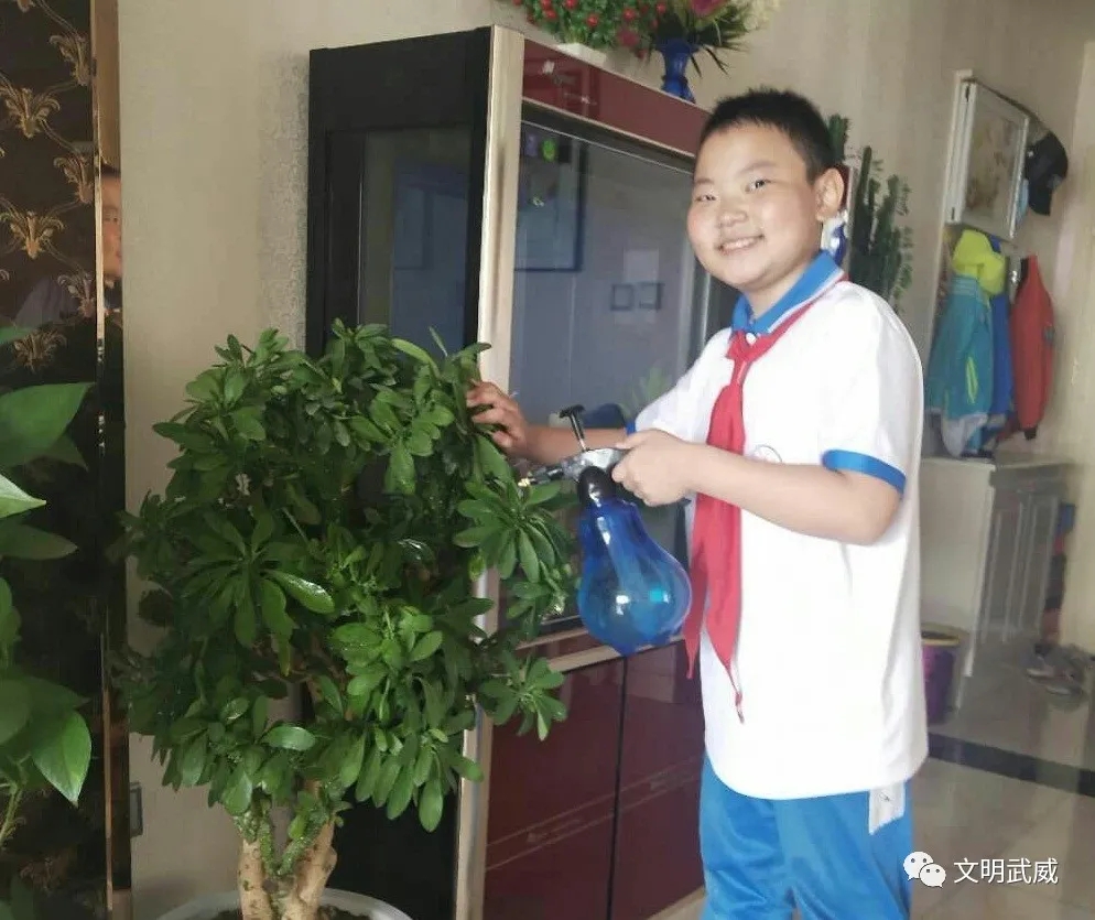每到周末,打扫清洁,拖地,浇花都是张万斌同学的拿手好活。吃完饭,张万斌就会主动将碗拿进厨房。爸爸妈妈在外工作,回到家十分劳累,张万斌早早便泡上了茶放在桌上,爸妈一回到家便可以喝上暖暖的茶。