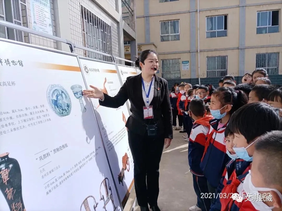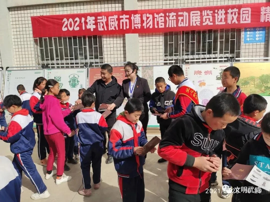 为了更好的发挥博物馆的社会教育功能,让更多的孩子近距离接触博物馆文物,了解家乡历史文化,丰富孩子们的精神文化生活。2021年3月26日,武威市博物馆走进武威第十一中学,组织开展了“流动展览进校园,精品课程进课堂”系列活动,为孩子们送去了一场别开生面的趣味教学活动。本次进校园活动通过图文展览和现场讲解的方式,向广大师生介绍了武威历史沿革和馆藏精品文物等内容,让师生们以文物为载体感受了家乡历史文化的魅力。