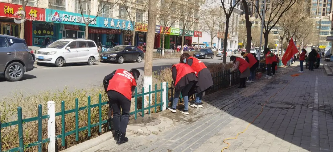 火车站街街道组织辖区内各单位及社区工作人员与志愿者,集中对区域内的广告标识牌、公交站亭、城市雕塑、交通防护栏、路灯杆、公园(广场)健身路径等公共服务设施和花坛、路沿石、绿化带等市政设施进行清洗和保洁。
