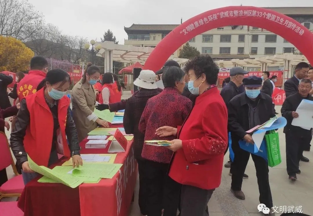 5.4月9日下午,武威市开展以“文明健康、绿色环保”为主题的第33个爱国卫生月宣传活动。市卫生健康委、市文明办、市爱卫办和市区医疗卫生单位志愿服务队,开展了健康咨询、健康义诊志愿服务,集中宣传了文明礼仪、垃圾分类、光盘行动、文明餐桌、人居环境整治、生态环境保护及科普知识。引导广大群众培养文明健康、绿色环保的生活方式。