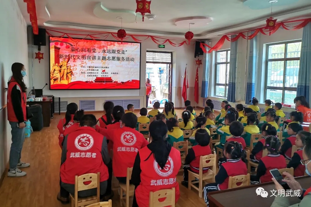 11.4月30日,武威市组织志愿者开展了“永远跟党走”新时代宣讲主题志愿服务活动。各部门单位通过专题宣讲、主题展览等形式,使广大干部群众厚植了爱党爱国爱社会主义情怀,树立了正确的党史观。
