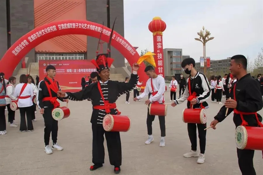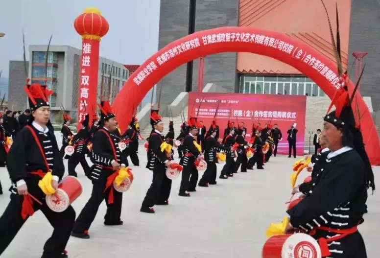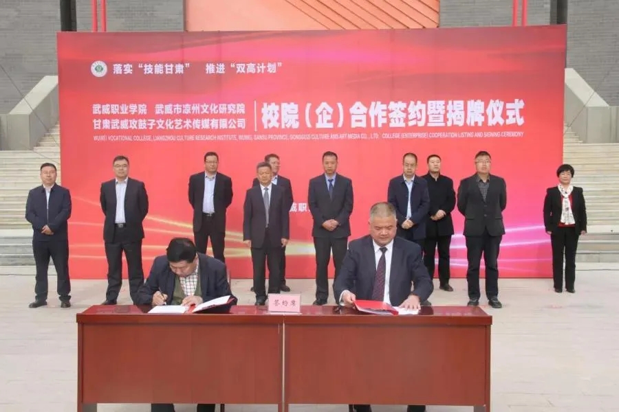 为有效推进非遗保护和传承,大力弘扬优秀传统文化,深化文明城市创建内涵,凉州区文化馆以推进凉州非物质文化遗产进校园为着力点,通过学、唱、传、颂等形式,营造全社会共同参与、关注和保护传承优秀传统文化的浓厚氛围,4月27日,甘肃武威攻鼓子文化艺术传媒有限公司与武威职业学院“校(院)企战略合作”签约暨揭牌仪式在武威职业学院举行,标志着凉州攻鼓子传承工作迈上了一个新台阶。