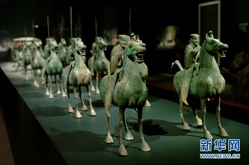1969年9月,雷台汉墓出土99件铸造精致的铜车马仪仗俑,全套车、马、俑排列组合的武装出行队列,为考古发掘中所罕见。