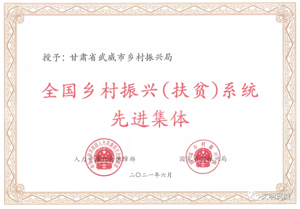 6月8日上午,全国乡村振兴(扶贫)系统先进集体先进个人表彰大会在北京会议中心隆重举行。大会对全国乡村振兴(扶贫)系统先进个人、先进集体进行了表彰,武威市乡村振兴局(原武威市扶贫开发办公室)荣获全国乡村振兴(扶贫)系统先进集体。