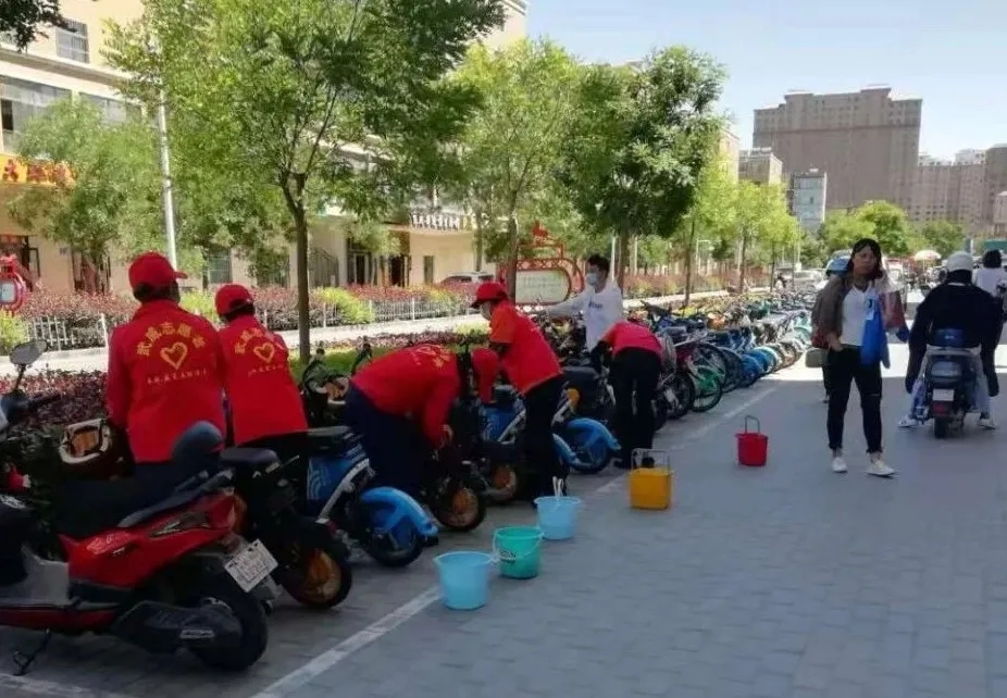 市中医院志愿者清洗路边共享单车