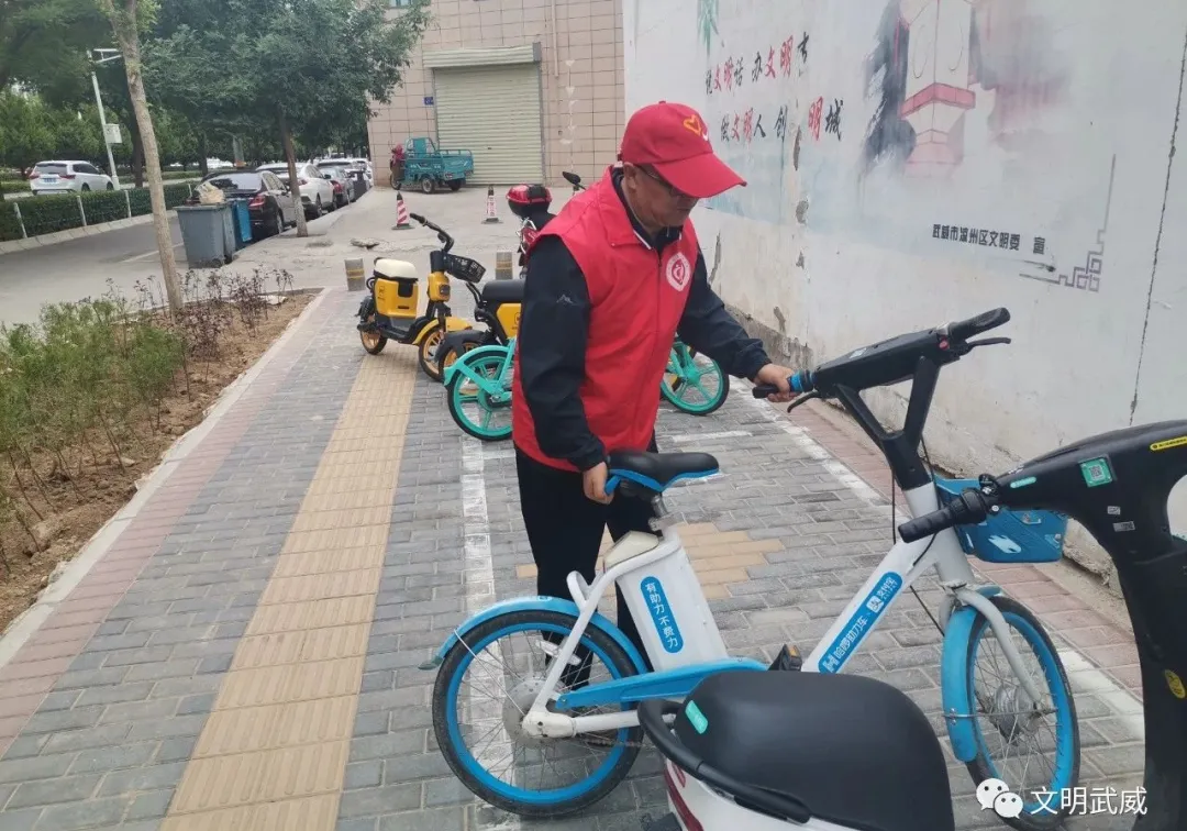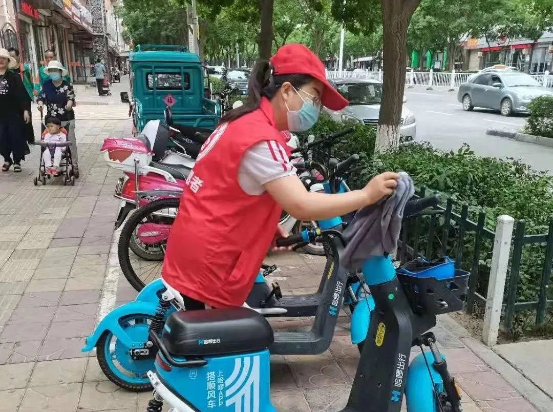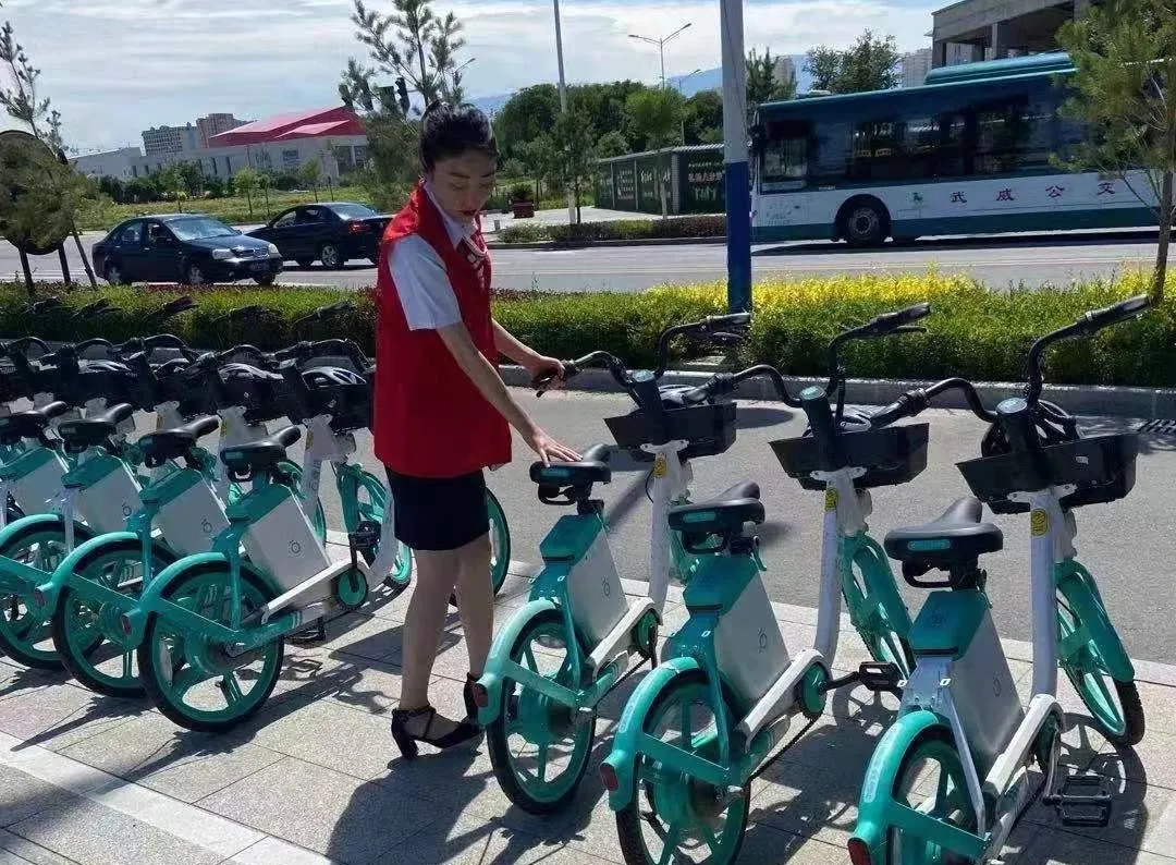 市供销社志愿者在包抓社区开展共享单车志愿服务活动。