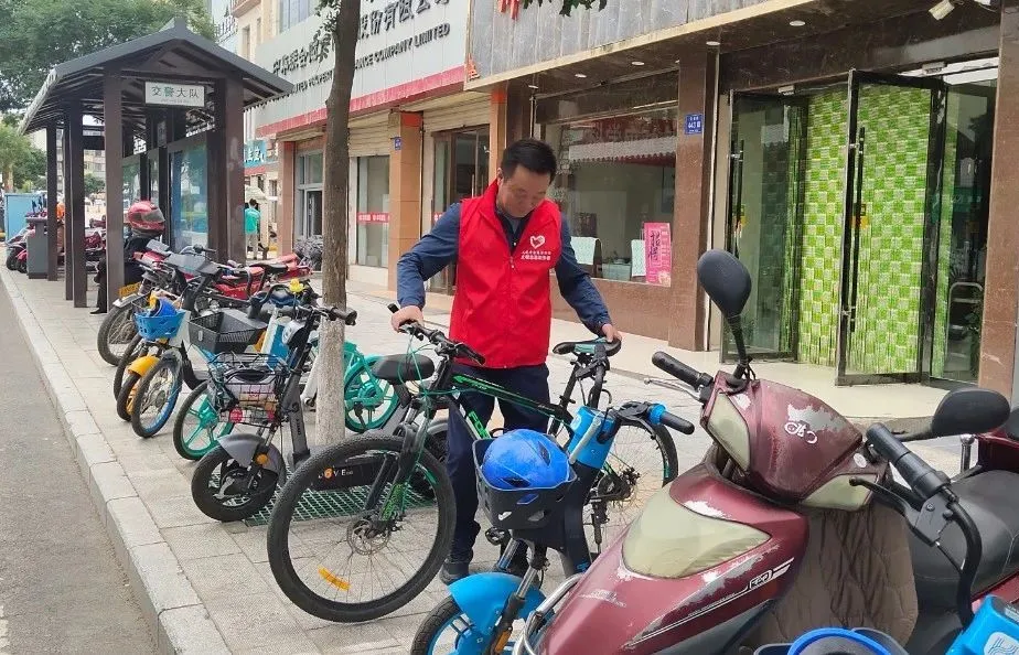 志愿者对十字路口周边乱停乱放电动车、自行车、共享单车进行整治,引导市民在停车区域文明停放。