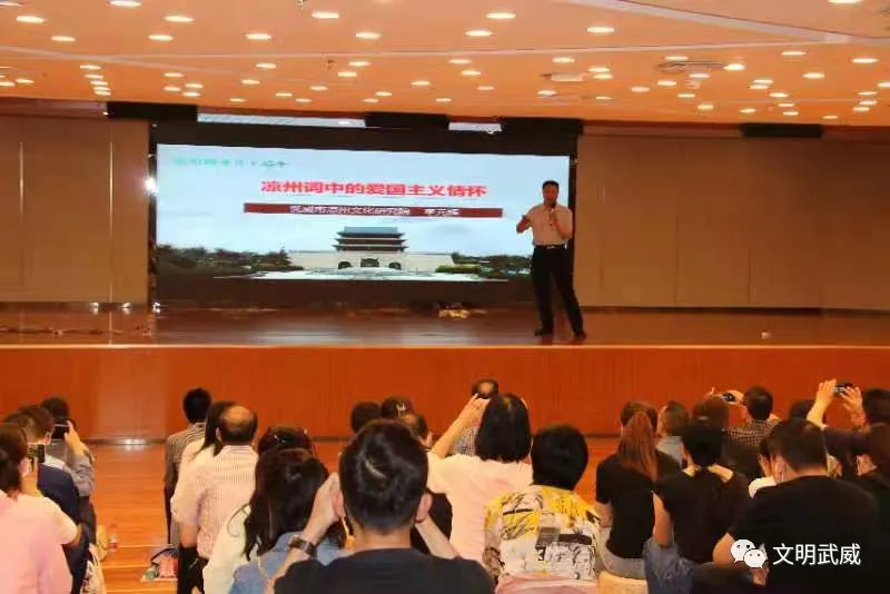 凉州文化研究院助理研究员李元辉老师紧紧围绕“凉州词中的爱国情怀”这一主题,深入浅出地分析了凉州词所蕴含的爱国主义精神,深刻阐释了爱国主义在不同阶段的精神实质和现实意义。讲座旁征博引、论述精辟,具有很强知识性和趣味性,不时博得现场观众阵阵喝彩。在全国上下喜迎中国共产党百年华诞,扎实推进党史学习教育的重要时间节点,举办此次活动对于激发全市广大干部进一步增强文化认同,厚植爱国情怀,凝聚起同心共筑中国梦的强大精神力量具有重要的推动作用。