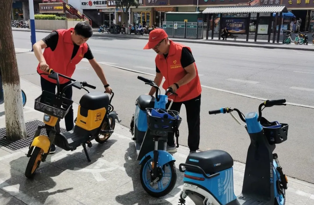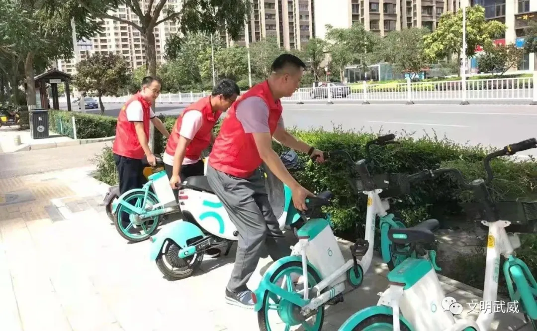 顶着炎炎烈日,为了给社区居民营造一个方便出行的良好的公共环境,志愿者把零星的单车集中摆放在停放区域,引导市民有序文明停放单车,助力建设美丽武威。