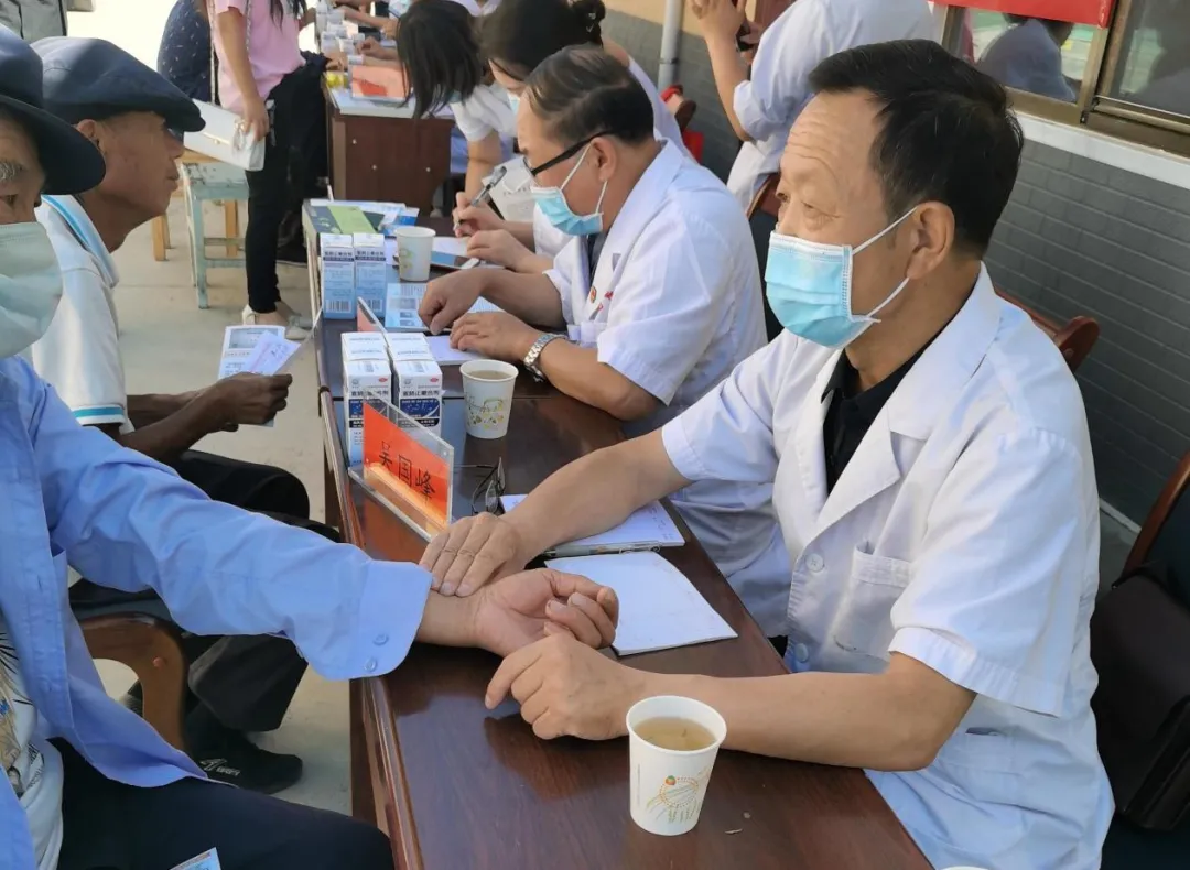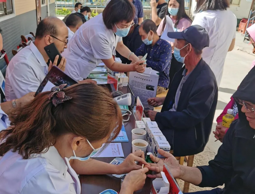 医疗服务队在张义镇卫生院同志们的协助下积极开展义诊,在卫生院院内空地设立医疗服务点,对前来就医问诊的群众把脉、测血压、测血糖、开处方、发放医疗队员们带去的药品,耐心为群众解答各种医疗保健问题并给与治疗建议。