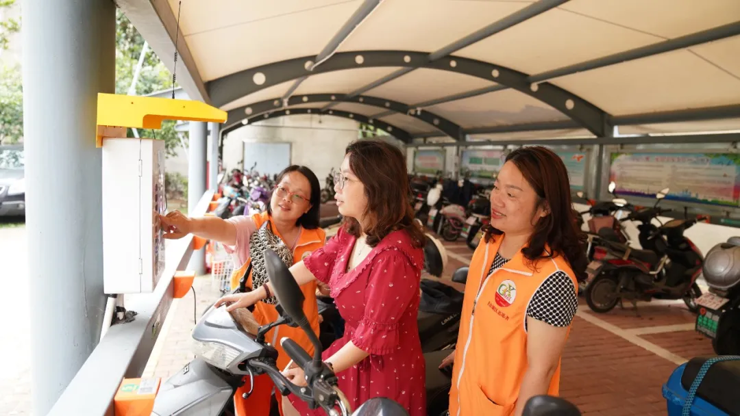 6月24日, 南昌市青山湖区塘山镇高新社区“清风志愿者服务队”的成员在和苑小区指导居民使用电瓶车充电装置。