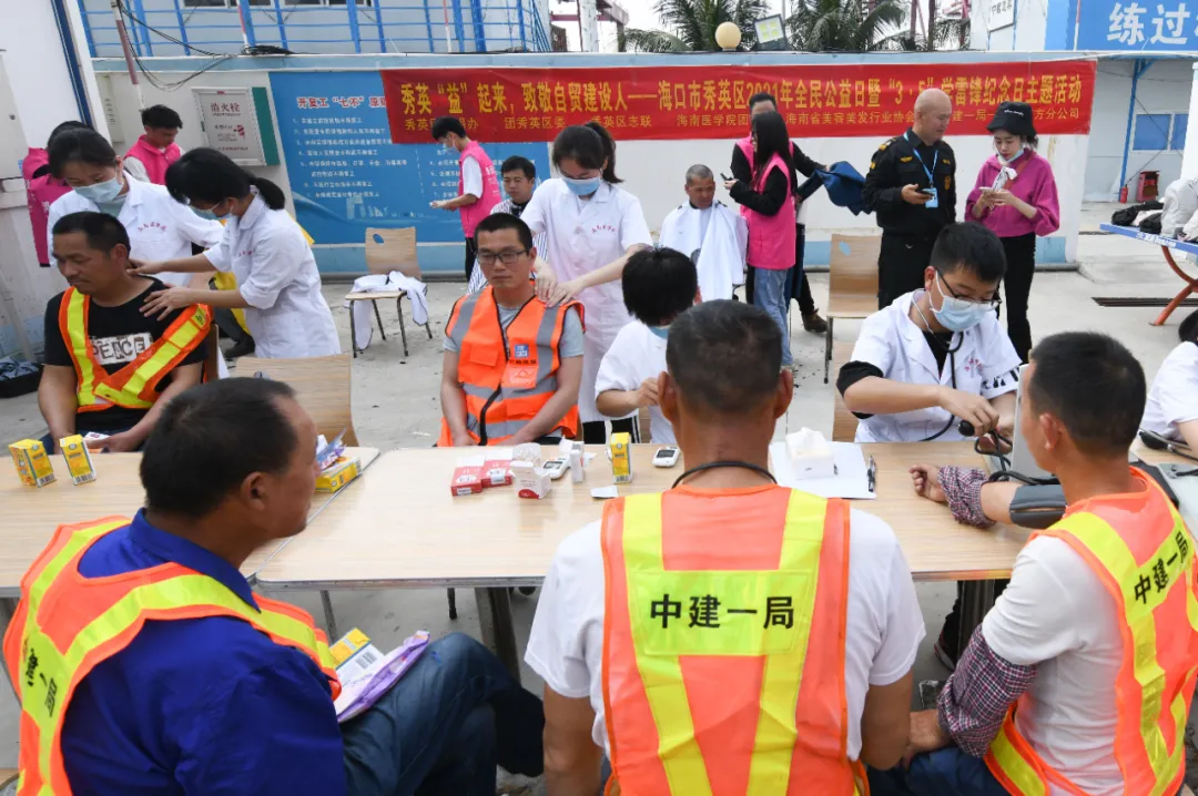 2021年3月5日,海口市秀英区文明办、共青团海口市秀英区委员会等单位组织志愿者,走进中建一局海口保利中央海岸四期商办项目工地,为工人送上义诊等志愿服务。
