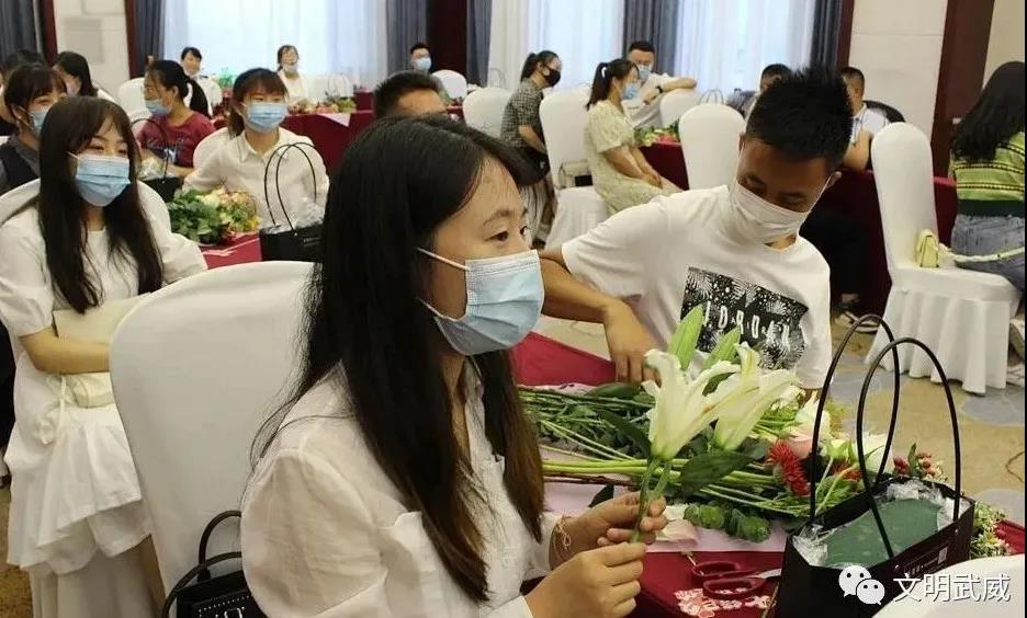 青年男女以花为礼,以花会友,通过插花活动传递节日祝福。