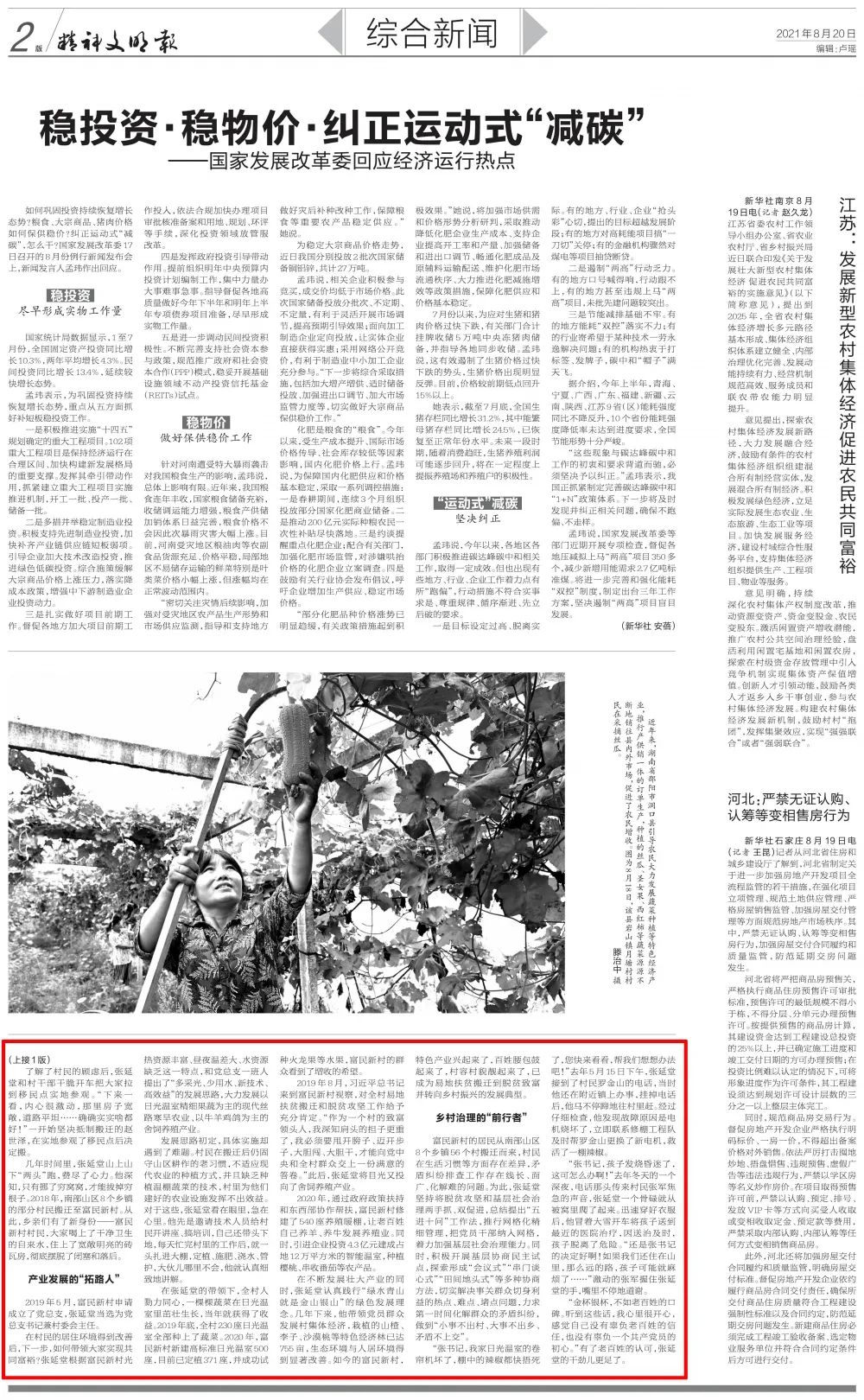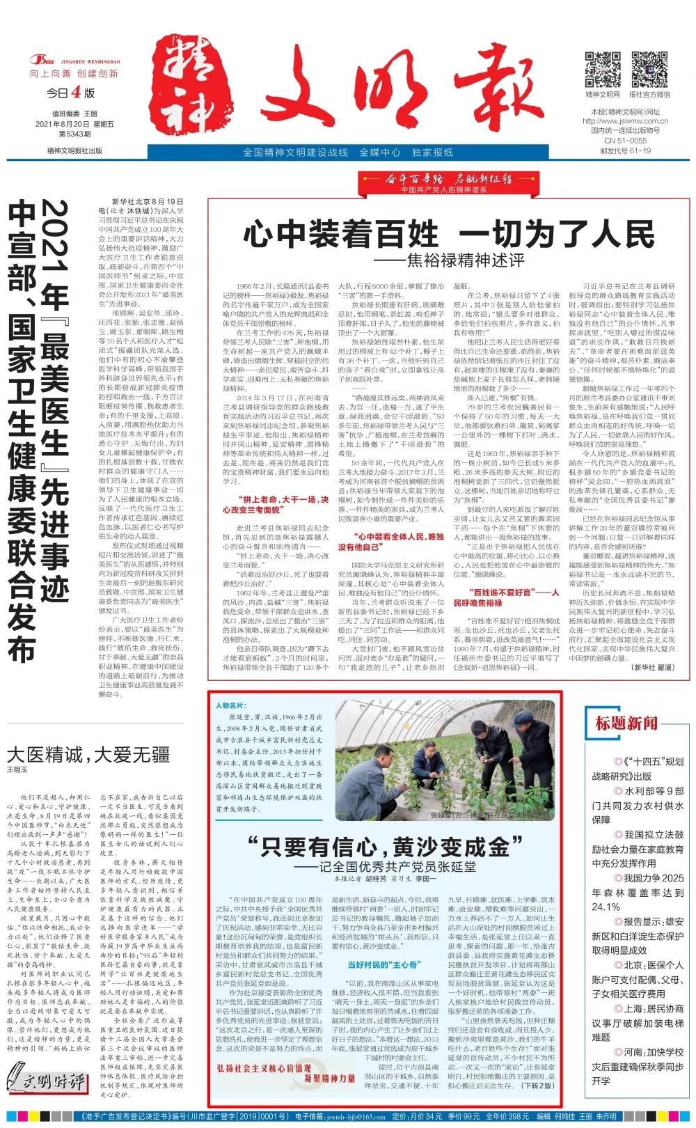8月20日《精神文明报》刊登“只要有信心,黄沙变成金”——记全国优秀共产党员张延堂。