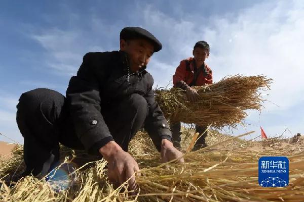 2020年3月5日,在古浪县北部沙区旱麻岗治沙点,八步沙林场第二代治沙人郭万刚(左)和第三代治沙人郭玺扎草方格压沙。新华社记者范培珅摄