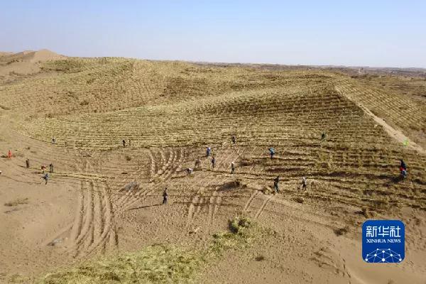 2020年3月6日,在古浪县北部沙区旱麻岗治沙点,八步沙林场治沙人扎草方格压沙(无人机照片)。新华社记者范培珅摄