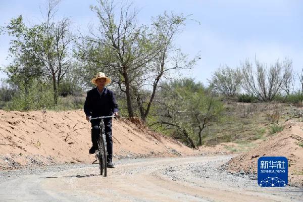 2020年9月1日,在古浪县八步沙林场,场长郭万刚骑着自行车巡护林场。新华社记者范培珅摄