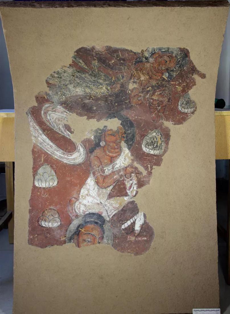 揭取修复的北凉弧形重层壁画中的飞天部分。