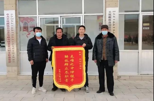 近日,天祝县华藏寺镇黄草川村村民马智河将一面危难之中伸援手 解救群众尽职责的锦旗送到了黄草川村村委会。