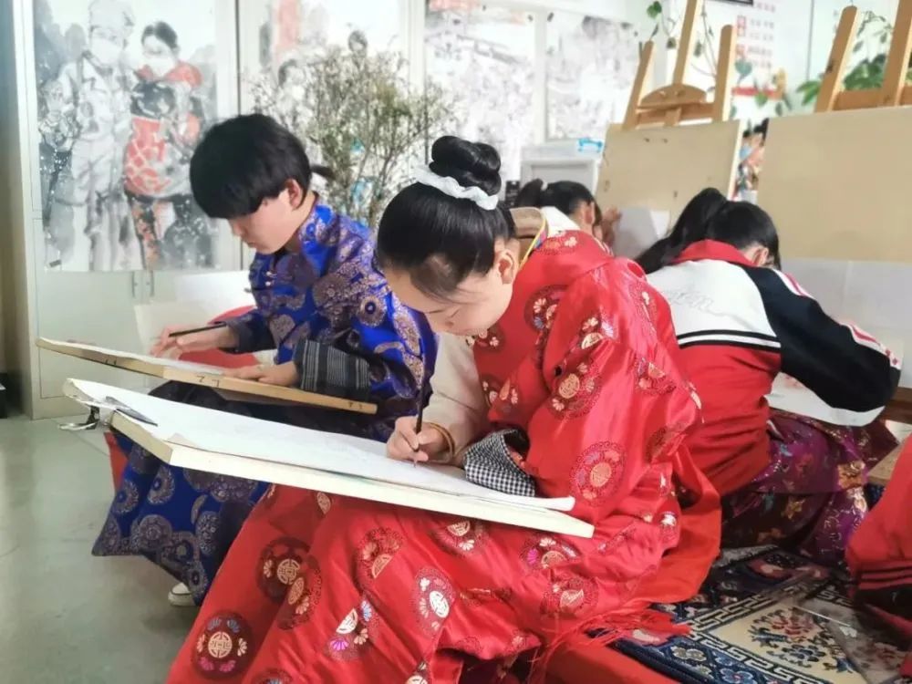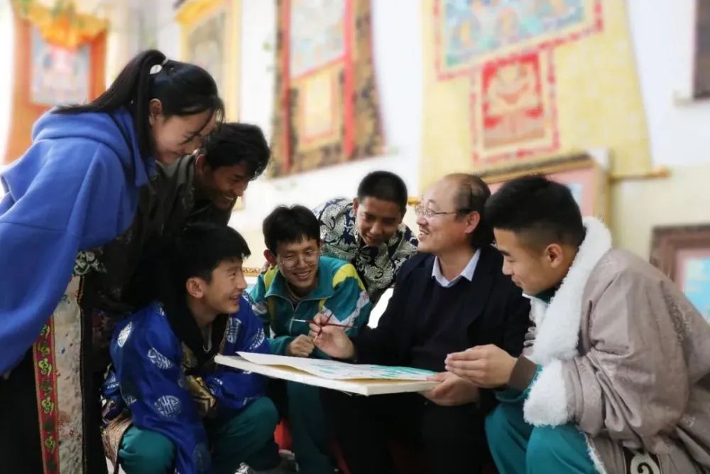 “学校先后创设了唐卡、藏文书法、藏棋、华锐民歌、藏族弹唱、民间舞蹈等中华民族优秀非遗文化传承社团,充分发挥社团育人功能,对提高学生素质起到了很大的促进作用,在丰富校园文化生活的同时满足了学生多样化需求。在稳步推进唐卡教学守正创新,增加新时代元素,创作新时代作品工作中,一是改进唐卡教学内容,由注重描画宗教人物向描画新时代英雄人物、重大历史事件转变,由注重描画内容向唐卡画法技法转变;二是优化唐卡课程安排,在唐卡教学过程中,注重传承和发展,融入社会主义核心价值观、爱国主义教育、民族团结进步教育,不断增强师生的‘四个认同’;三是在唐卡展室增加社会主义核心价值观、‘三个离不开’等宣传内容,在向学生传授唐卡技艺的同时,筑牢学生中华民族共同体意识。”天祝县民族中学校长华岩说。