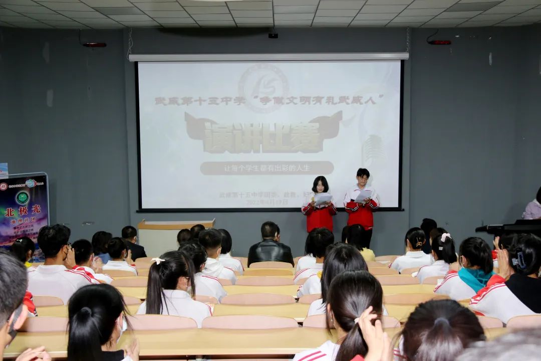 为弘扬社会主义核心价值观,传播文明理念,培育文明新风,教育引导广大青少年积极参与文明实践和全国文明校园创建,助力全国文明城市创建工作,进一步有效落实“双减”政策,为第27个世界读书日营造浓厚氛围,4月19日,武威第十五中学举办“争做文明有礼武威人”青少年演讲比赛。