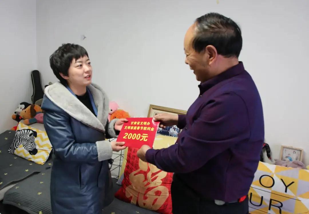 在新春佳节来临之际,受省文明办委托,市文明办开展文明家庭慰问关怀活动。1月26日,市文明办主任王晓带队看望慰问了第二届甘肃省文明家庭逯吉林家庭,为他们送去慰问金和新春的祝福。