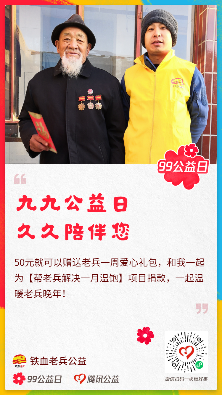 我是中华社会救助基金会《铁血老兵公益》甘肃团队负责人,每月10号,我总是带着几位公益爱心人士,到20位兰州籍和民勤籍抗战老兵和抗美援朝老兵家中,送去关爱和温暖,送去生活用品和营养品,送去衣物和被褥,送去一个又一个爱心人士对老兵们的情谊和爱。