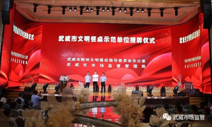 市文明办分管领导宣读了《武威市精神文明建设指导委员会办公室武威市市场监督管理局关于命名2021年度“文明餐桌示范单位”的决定》,市市场监管局分管领导向获得“2021年度文明餐桌示范店”的武威天漠蓝钻餐饮管理有限公司颁发了牌匾。希望该公司珍惜荣誉、再接再厉,充分发挥“文明餐桌”示范引领带动作用,落实“六项承诺”,将文明、健康、节俭、绿色、低碳习惯融入市民的日常生活中,使勤俭节约、文明用餐理念广为人知、成为认同、变为行动。