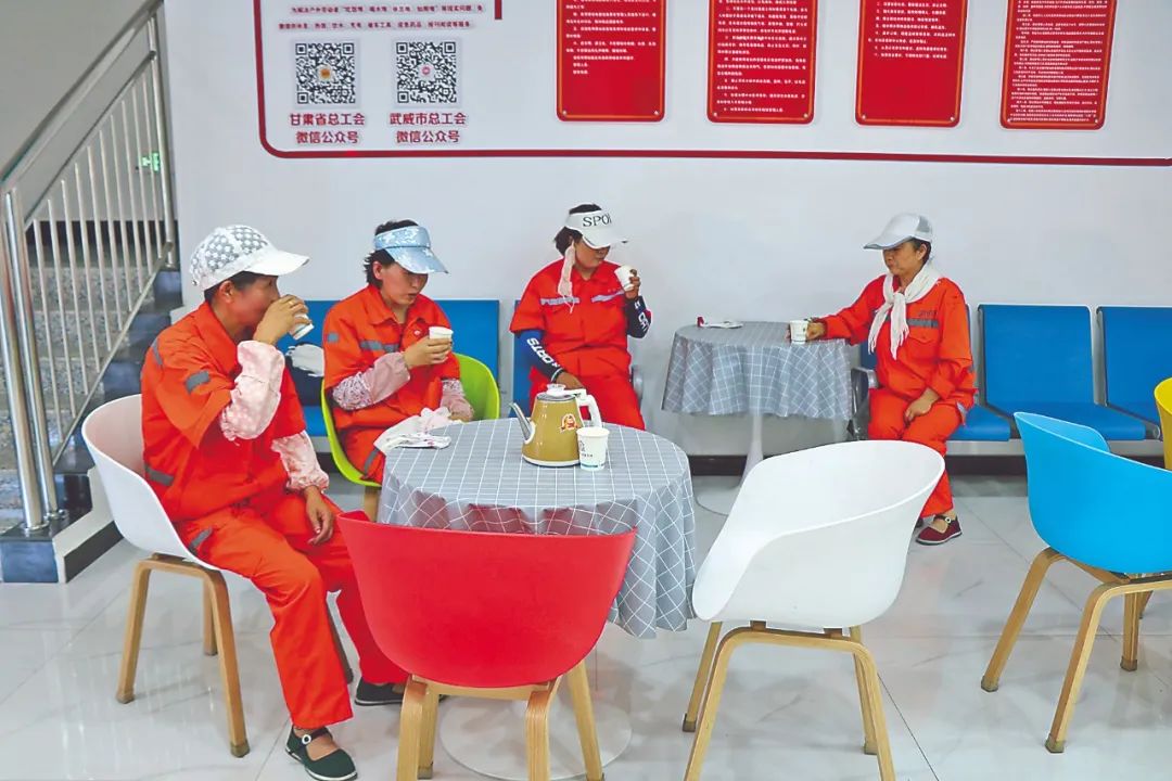 环卫工人刘大姐负责西凉南市场保洁工作,忙完手头的活后,她和同伴一道来到武威市工人文化宫户外劳动者驿站,这儿有开水、热茶,她们能随时进来纳凉、喝茶、上厕所。