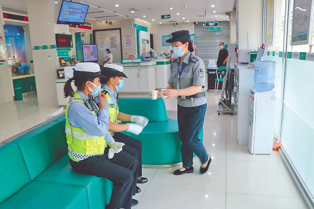 市公安局凉州分局交警大队城关中队执勤辅警银媛媛利用工作间隙,和同伴来到农行凉州支行劳动者驿站,一杯热茶让她感到特别解渴。
