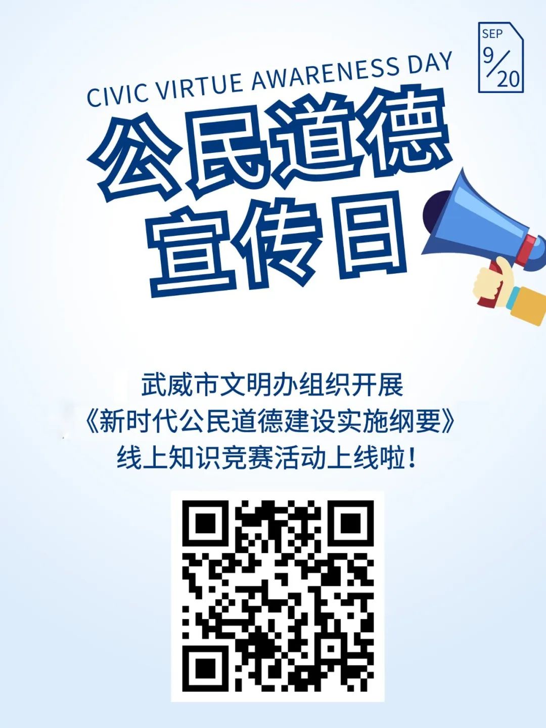 公民道德建设是精神文明建设的内核,也是城市文明程度的决定性因素。为大力推进公民道德建设,引导公民向往和追求讲道德、尊道德、守道德的生活,在全社会营造崇德向善的浓厚氛围,在公民道德宣传日来临之际,武威市文明办组织开展《新时代公民道德建设实施纲要》线上知识竞赛!欢迎广大居民朋友积极参与!