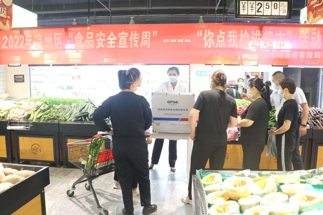 为积极发挥市场监管职能作用,聚焦群众关心的热点、难点问题。在食品安全宣传周活动期间,市、区市场监管部门坚持把食品安全宣传与检验检测紧密结合,在农贸市场、凉州区京华超市等单位开展你送我检、你点我检”诚信宣传活动,让更多消费者直观了解食品安全快速检测全过程,“零距离”把控“舌尖上的安全”,切实为守护消费者“菜篮子”筑起了一道“防火墙”。