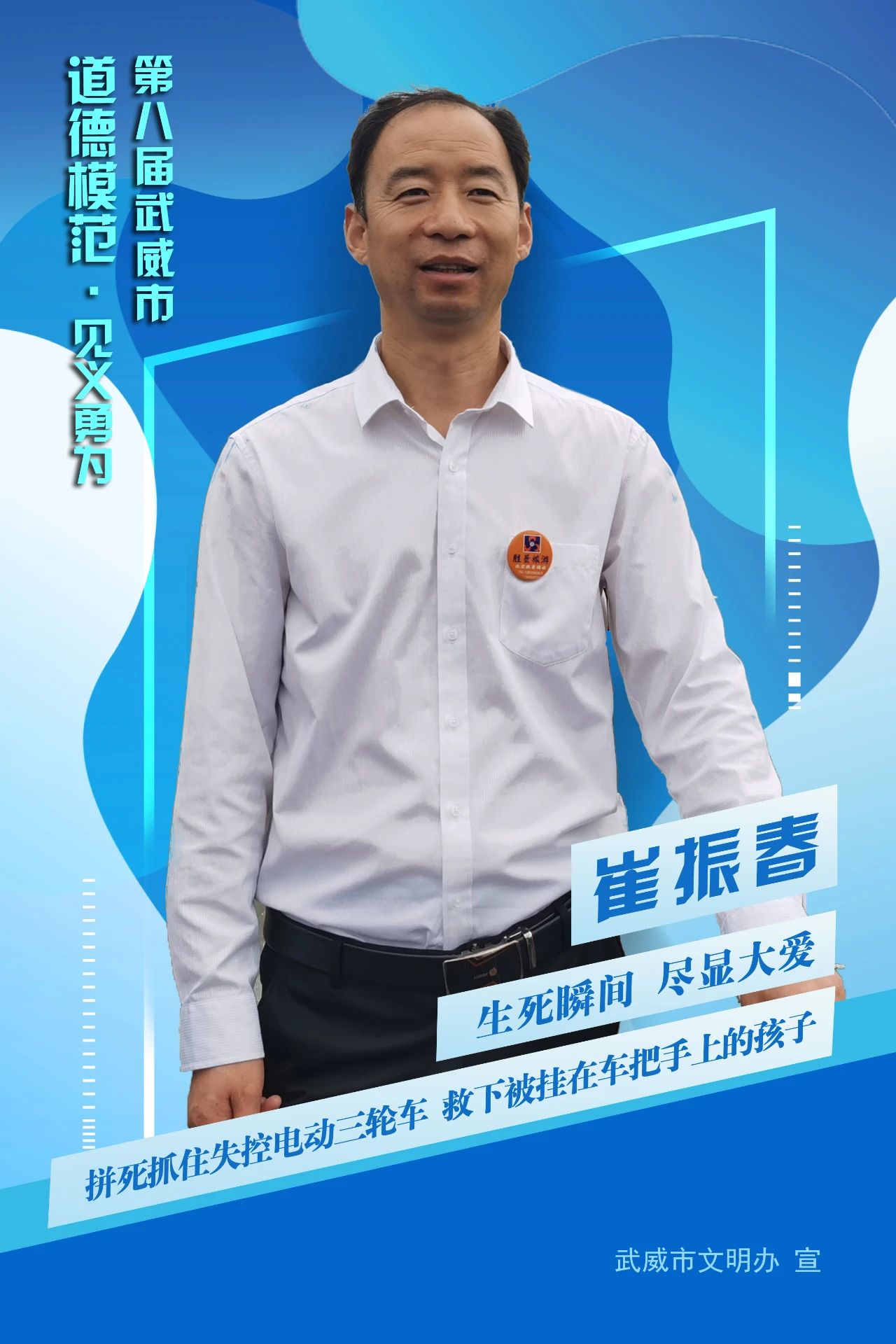 2022年4月23日中午,崔振春正在街上买水果,看到一个小孩被挂在飞驰的电动三轮车把手上,他不顾自己安危,冲上前去救下了小孩,车上的孩子稳稳的站在了地上,自己却被重重摔在地上,造成了他左侧股骨头骨折。住院期间,他怕父母担心,一直瞒着两位老人,忍着伤痛每天打电话向父母问好。被救小孩家属多次前去看望他,但他都一一谢绝了。他把“助人是快乐的”当作一种信念,当作一种心态,一种优秀的品德,他从小就冠有“老好人”“好好先生”的称号,他用生活中的平平凡凡的事,点点滴滴的情诠释着一位平凡人助人为乐的胸襟,他就是我们身边助人为乐的典型,是构建和谐社会的脊梁。