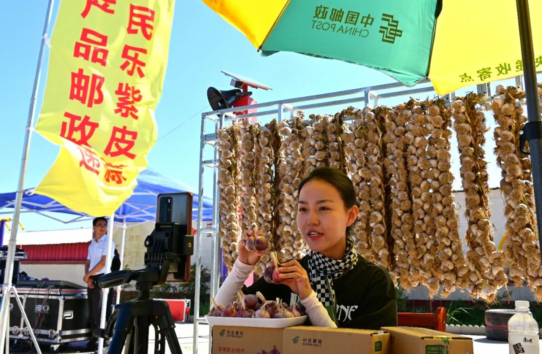 志愿者现场直播销售洪水镇特色产品——紫皮大蒜
