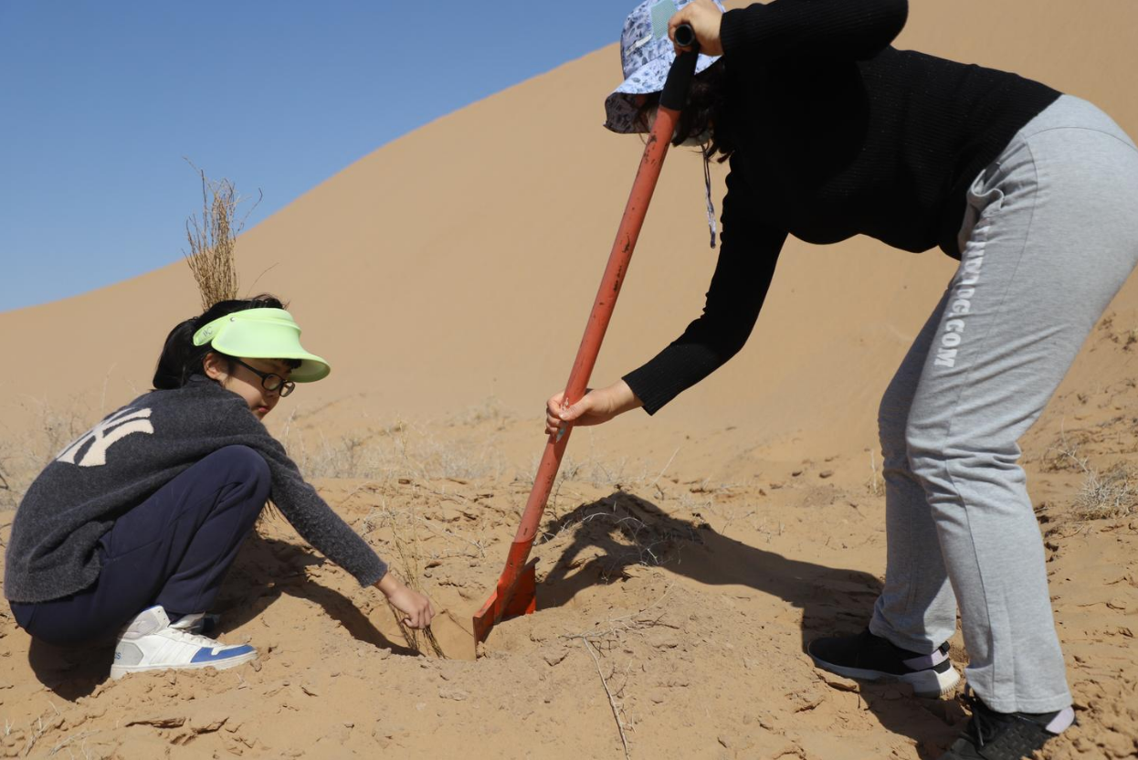 一会儿扶树苗,一会儿数树苗,一会儿做检查员,一会儿做通讯兵,半大的小化清在植树现场来回跑跳,忙得不亦乐乎。每每跟着大人们植树,她也能从中学到很多关于种树的知识,有时还会充当小小讲解员为新加入的志愿者介绍各种沙生植物,用她那小小的身躯,贡献着自己最大的能量。