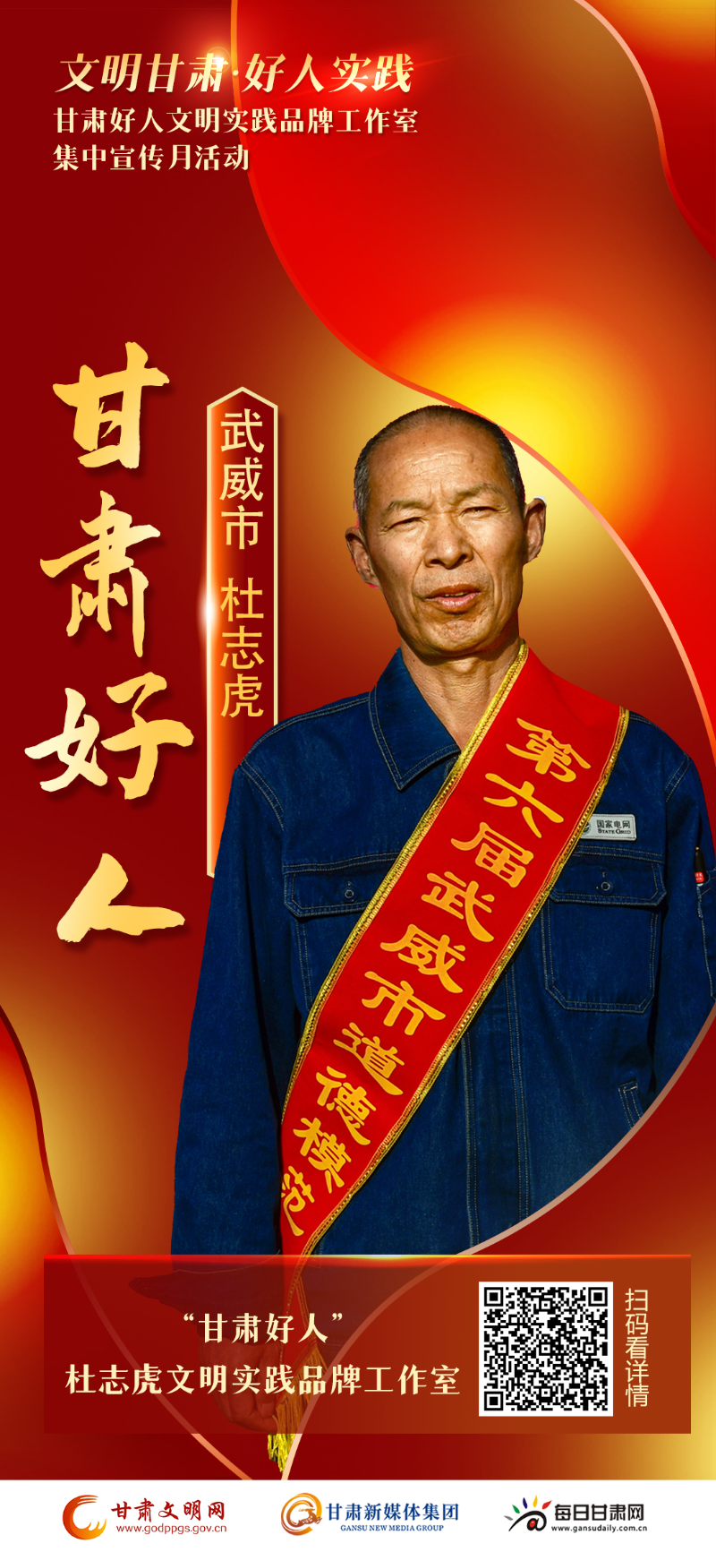 “甘肃好人”杜志虎文明实践品牌工作室自成立以来,以“真诚、热爱、奉献、快乐”为服务理念,组织开展敬老助残、扶危济困、爱心助学、关爱留守儿童及环卫工人等爱心公益志愿服务活动,向广大群众传递好人奉献精神,传递崇德向善社会正能量。