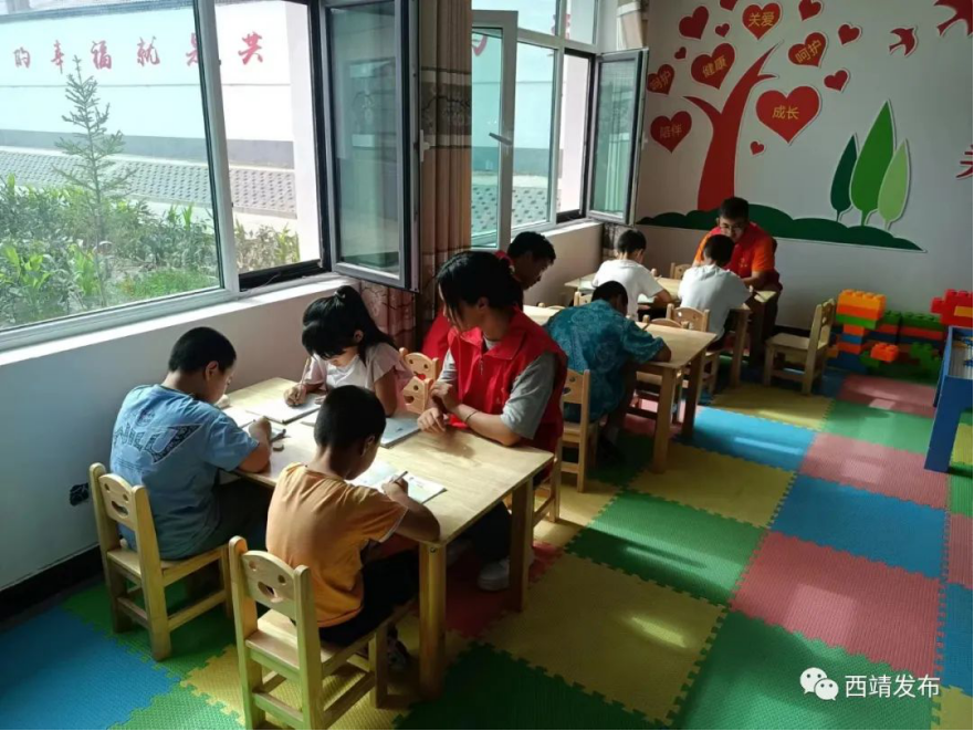 大学生志愿者在农家书屋对儿童进行暑期辅导