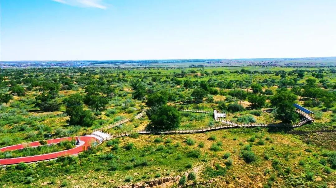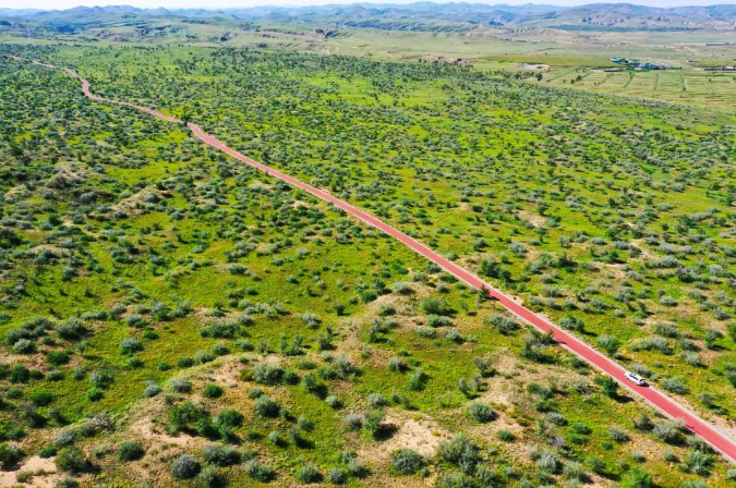 秋风送爽,被雨水浸润的八步沙林场生机盎然,平坦宽敞的环林路如同红色的绸带飘向远方。移步远眺,花棒随风摇曳,梭梭、红柳、沙拐枣、香茅草依偎在环林路两旁,守护着绿色希望。当年风沙肆虐的荒芜之地,如今草木繁茂,郁郁葱葱。