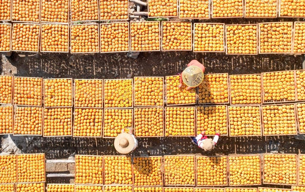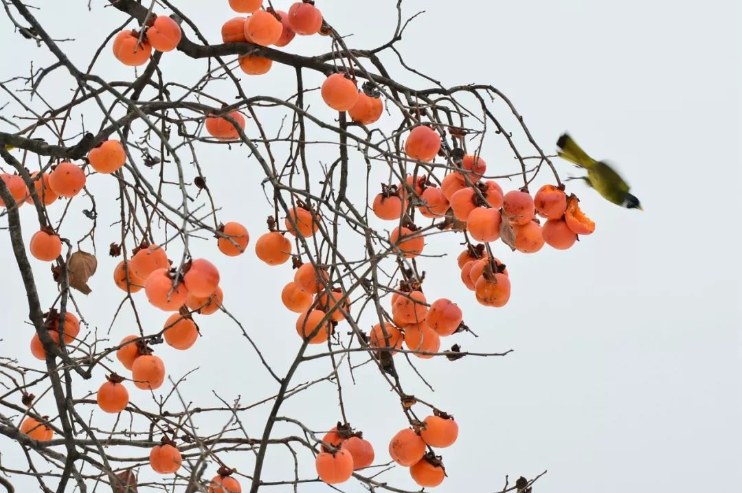 秋霜让柿子悄悄“红了脸”,枝头硕果累累,如灯笼满枝,