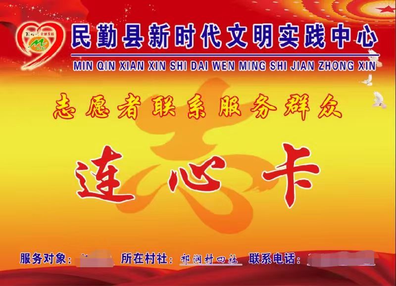 制作连心卡片,畅通联系渠道。镇(村)新时代文明实践所(站)组织志愿者深入村社农户摸底排查,准确掌握困难对象基本情况和最现实、最迫切的需求,建立联系服务困难群众连心卡制度,采取“一对一”“点对点”志愿服务模式,就近为每个空巢老人、留守儿童、残疾人等重点服务对象确定志愿者,有针对性地开展理论宣讲、政策解读、亲情陪伴、卫生清洁、健康义诊等服务活动。统一制作印发连心卡,向群众公开志愿者姓名、性别、所在村社、服务特长以及联系电话等基本信息,方便群众在有困难和需求时随时联系,真正打通联系群众、服务群众“最后一公里”,“群众需求在哪里,志愿服务就延伸到哪里”的服务机制日趋成熟。