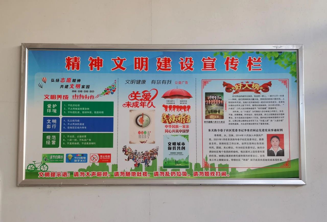东关街寺巷子社区持续大力开展精神文明创建活动,日常组织工作人员和志愿者深入居民楼院宣传宣讲,同时利用宣传栏、LED显示屏、海报、各类文化活动等载体加强宣传,让精神文明之风吹到了社区内的每一个角落。