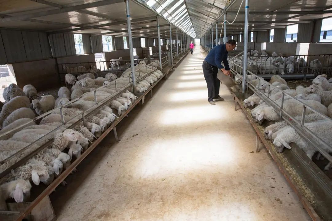 养殖户在羊棚喂羊