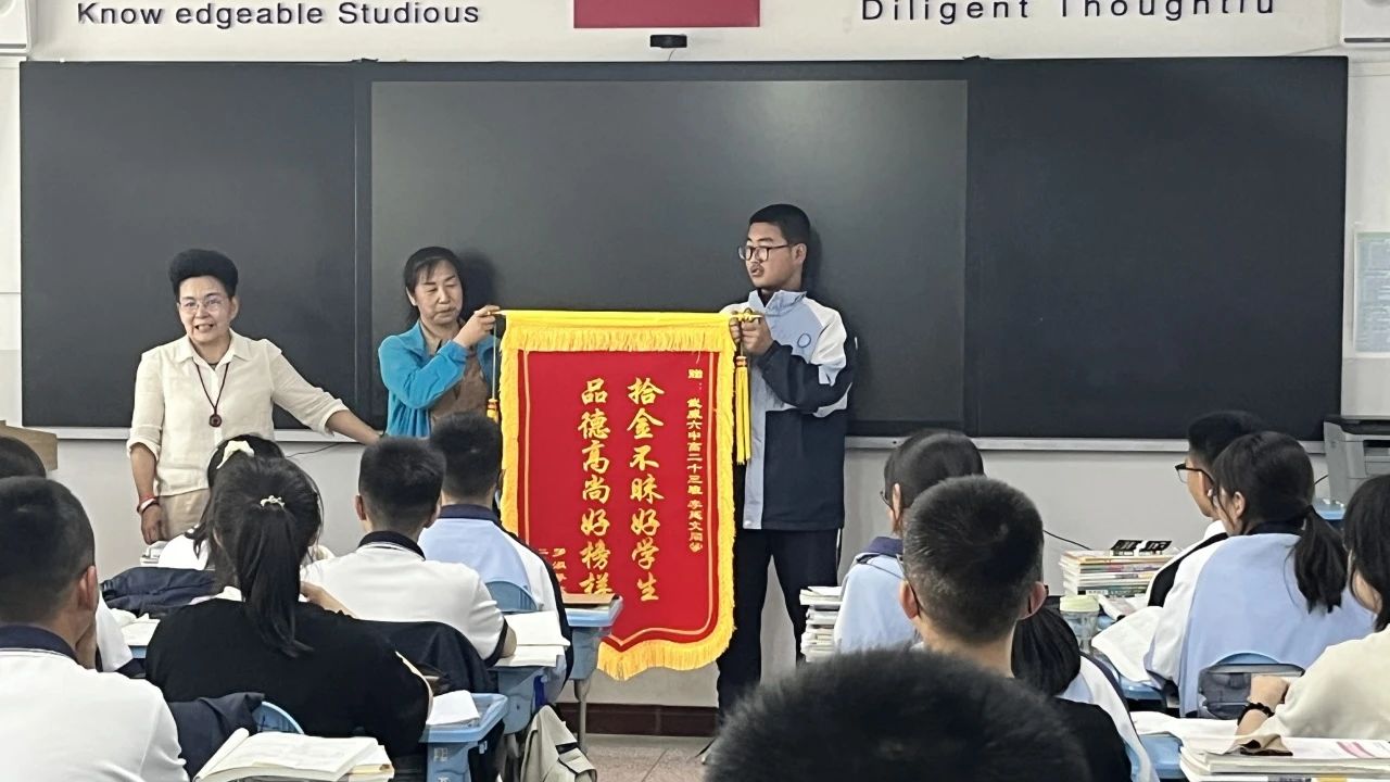 4月5日,我校高二(13)班李延文同学在归家途中捡到一个白色手提包,内有三部手机、钥匙及重要证件。在原地等候失主无果后,李延文同学及时将装有贵重物品的手提包送往了宣武街派出所。最终在派出所多方努力下,辗转联系到了失主,失主罗女士在钱包失而复得后,亲自到学校给李延文同学赠送锦旗,表达了最真挚的谢意!