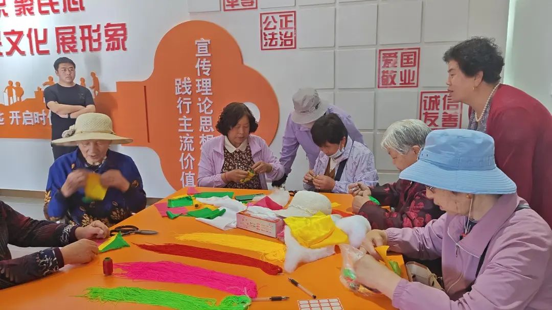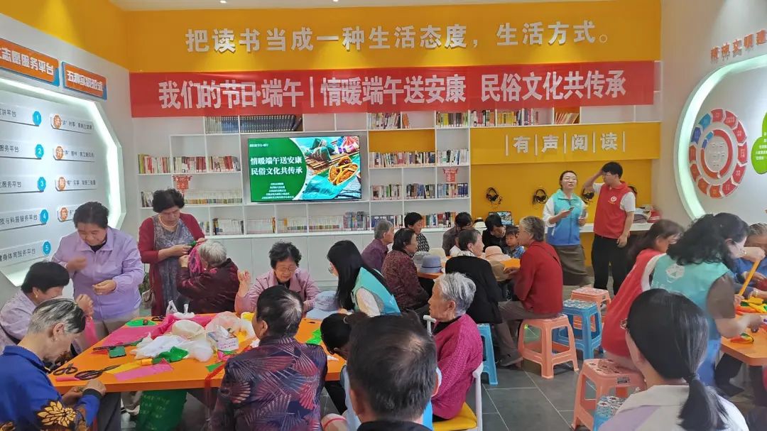 在制作荷包结束后,还为老奶奶们准备了油饼卷糕、西瓜等美食。老奶奶们脸上洋溢着笑容,表达节日的问候和祝福,营造群众互帮互助以及关心关爱老人们良好氛围,让他们充分感受到党和政府的关怀与温暖。活动现场的外围还准备了展板,让群众了解端午节的文化历史。