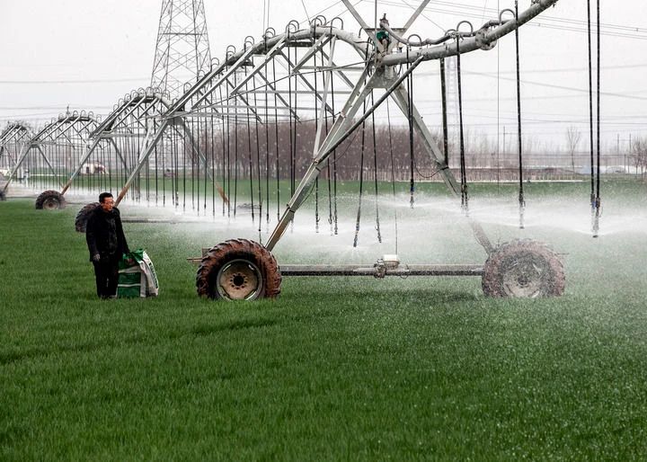 2024年3月18日,在河南省焦作市博爱县孝敬镇东原庄村瑞辉家庭农场,村民使用全自动指针式喷灌机进行浇灌作业。