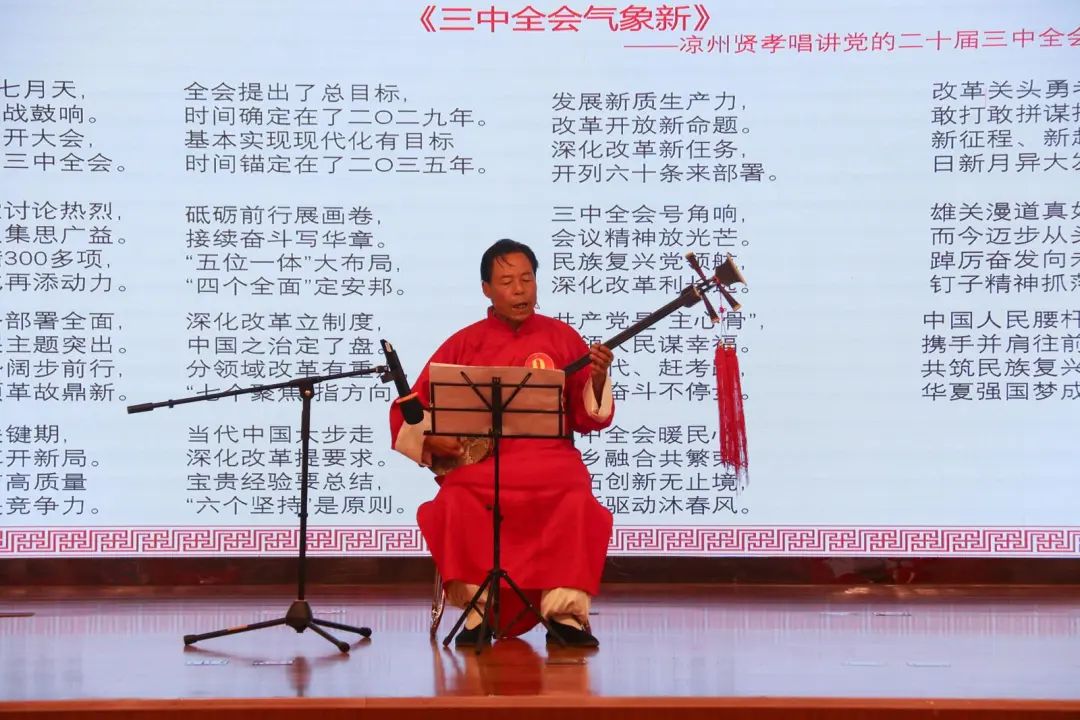 不仅如此,围绕学习宣传党的二十届三中全会精神,凉州区充分挖掘文艺资源优势,转变以往念文件、搞宣讲、读报纸的“老三套”做法,将党的理论政策宣讲与“凉州贤孝”这一曲艺形式相结合,组织贤孝艺人深入田间地头、公园广场、生产车间、集贸市场等基层一线,用凉州贤孝弹唱的方式宣讲党的声音,让群众在欢声笑语中,学习党的政策,感受党的关怀和家乡的巨大变化,使党的二十届三中全会精神在基层落地生根、开花结果。