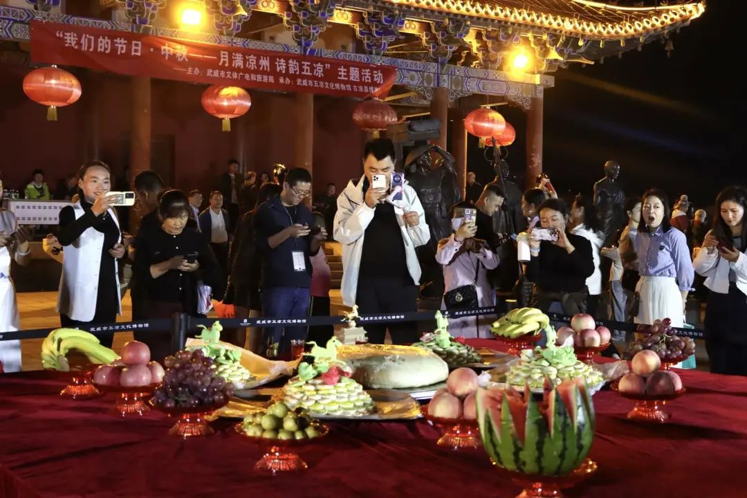 9月17日晚,武威市五凉文化博物馆在南城门楼举办“我们的节日·中秋—— ”主题活动。活动现场,武威市五凉文化博物馆根据当地传统习俗,将民间拜月场景予以复原,文艺工作者现场挥毫泼墨、题字作画,赠予参加活动的青少年及现场游客,为大家送上节日祝福,共庆中秋佳节。非遗集市上还展示了凉州重刻剪纸、凉州结绳、凉州编织、咕噜手串等非遗文创产品,充分展示了中华传统民俗的魅力,大力弘扬了中华优秀传统文化,营造了喜庆、欢乐、祥和的节日文化氛围,丰富了广大市民精神文化生活。