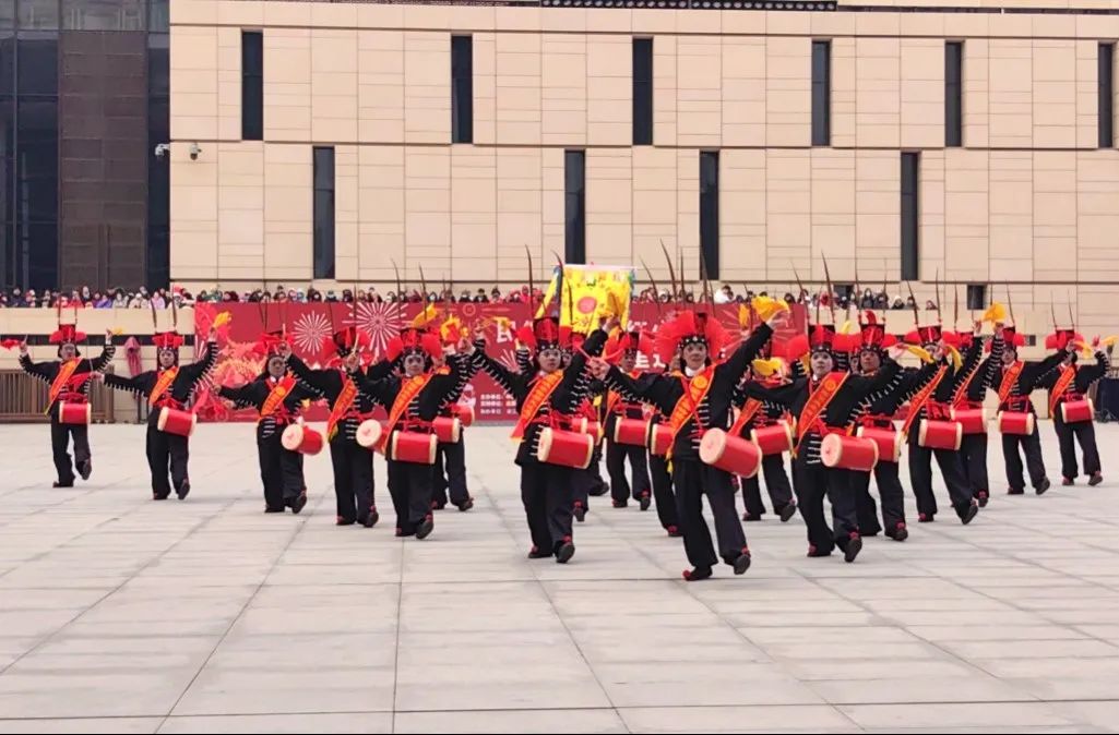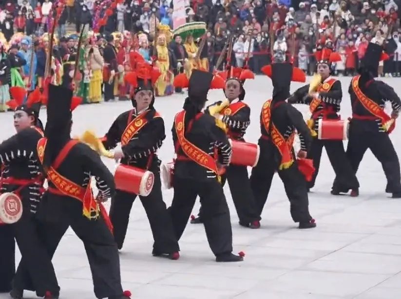 鼓声渐次升腾,30多名黑衣武士列阵而起,身着太保衣,帽插红雉翎,神情冷峻透出凛然杀气。阵法变换间,鼓点与脚步共振,斗志与武魂同频,双臂胸前划弧,鼓槌上下翻飞,进退开合间,“两军对垒”“四门斗敌”“登高望远”等队形灵活腾挪、穿插交错,以“攻”为鼓魂,舞出西北莽原的粗犷壮美,重现金戈撞击、战马嘶鸣的磅礴之气。